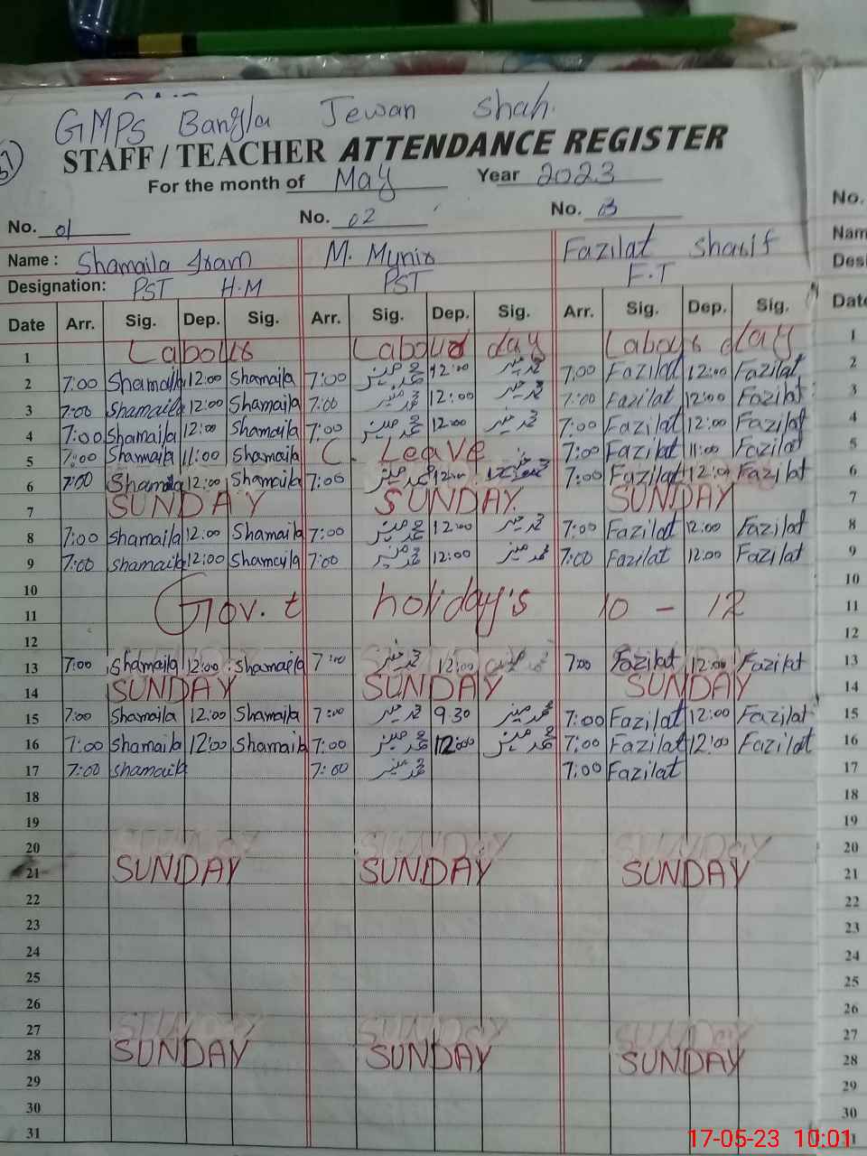 | Name: SH**** IR**** Designation: (School Headmaster's/Headmistress's) PST Phone/Cell Number: 03**** |