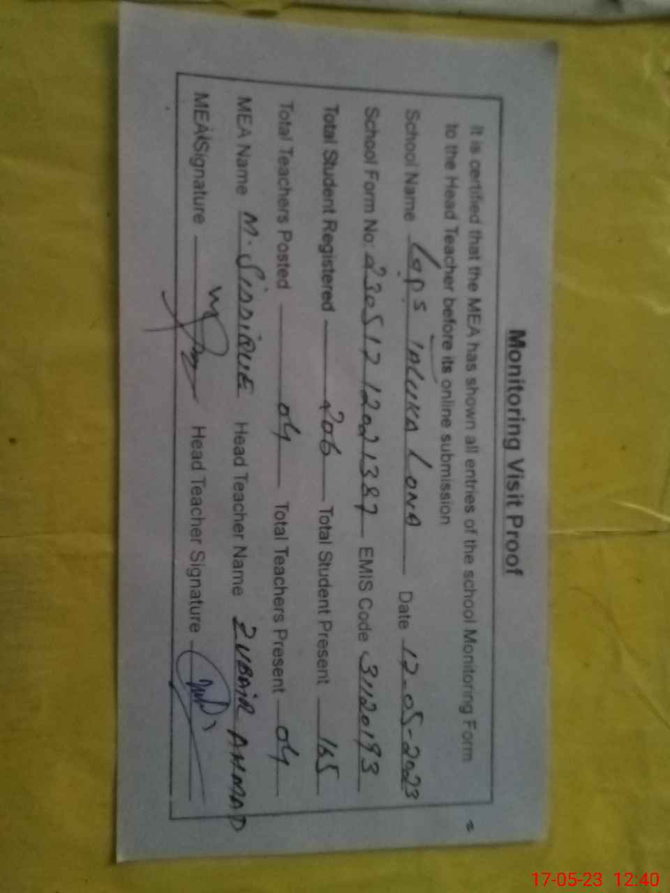 | Attendance Register | Head Teacher | MEA with School | Visit Proof |