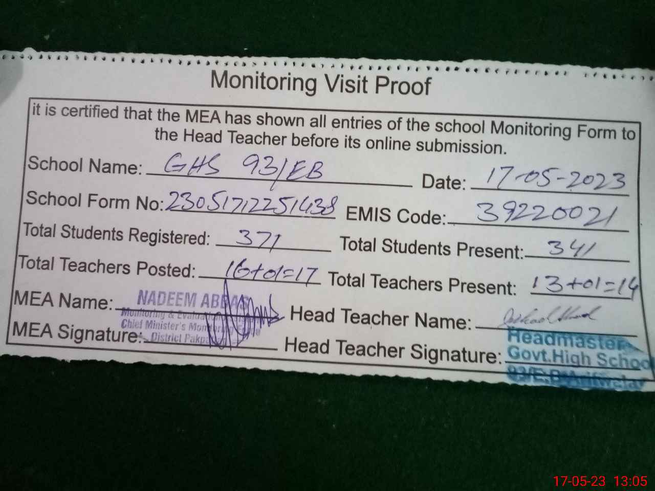 | EMIS Code: 39220021 | Name of School: GHS 93/E-B TEH ARIF WALA | |||