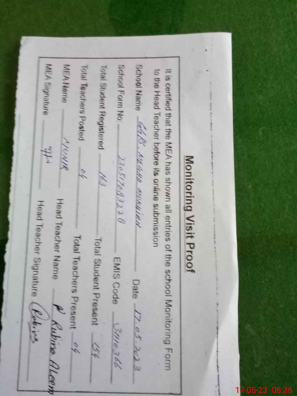 | Attendance Register | Head Teacher | MEA with School | Visit Proof |