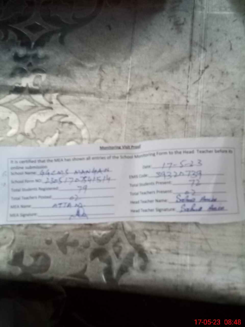 | Attendance Register | Head Teacher | MEA with School | Visit Proof |
