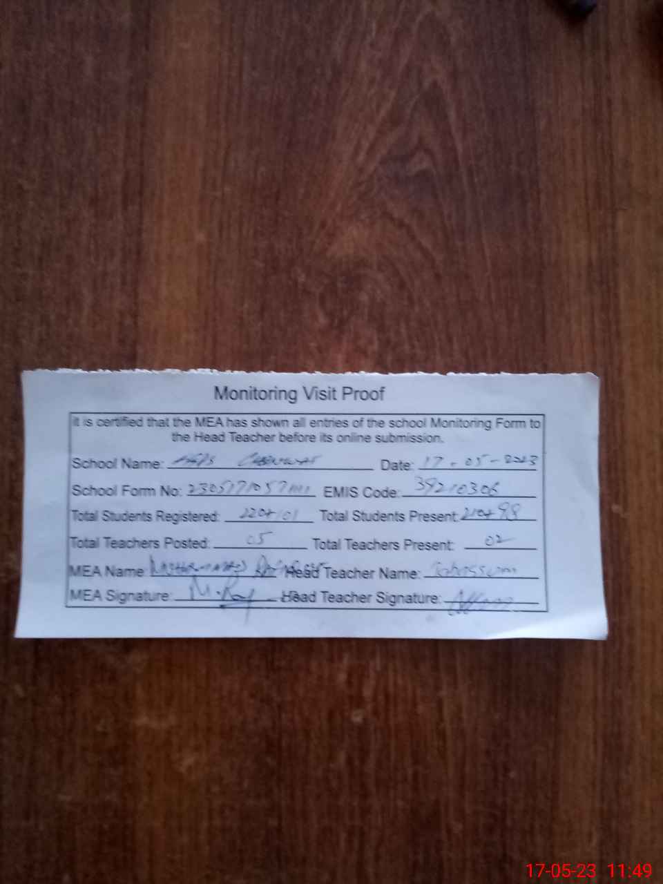 | Attendance Register | Head Teacher | MEA with School | Visit Proof |