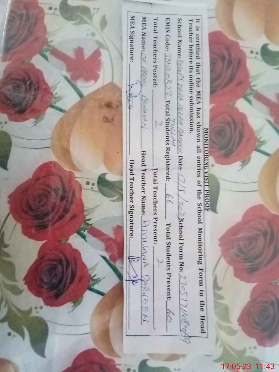 | Attendance Register | Head Teacher | MEA with School | Visit Proof |
