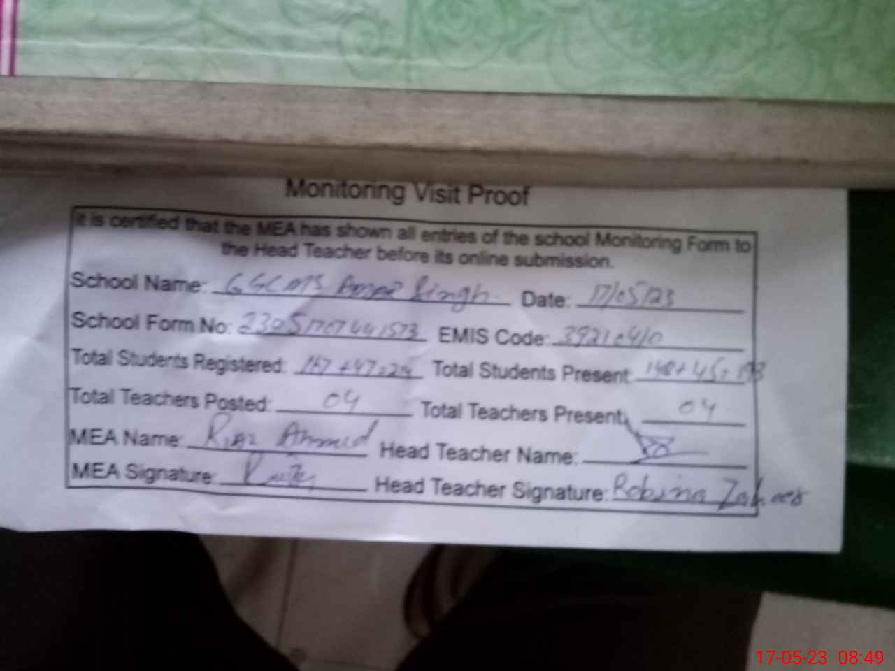 | Attendance Register | Head Teacher | MEA with School | Visit Proof |
