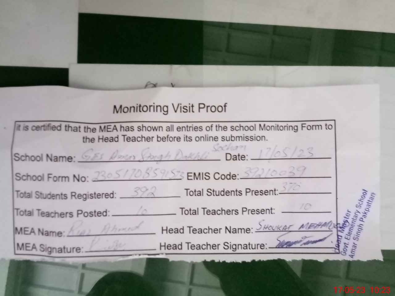| Attendance Register | Head Teacher | MEA with School | Visit Proof |