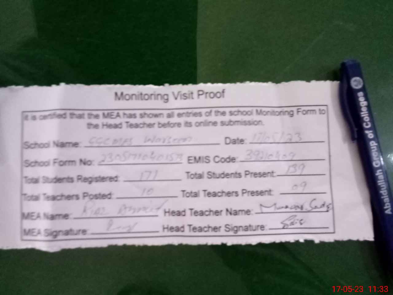 | Attendance Register | Head Teacher | MEA with School | Visit Proof |