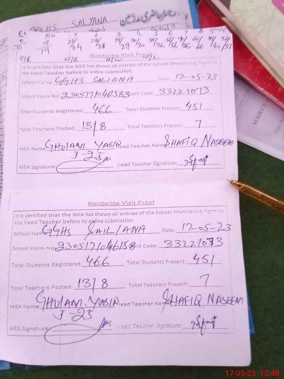 | Attendance Register | Head Teacher | MEA with School | Visit Proof |