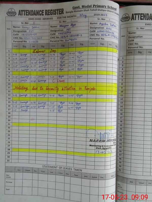 | CNIC | Full Name | Designation | R/C | Absence During Last Calender Month |