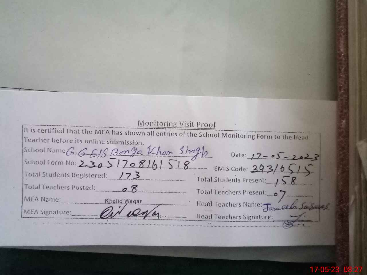 | Attendance Register | Head Teacher | MEA with School | Visit Proof |