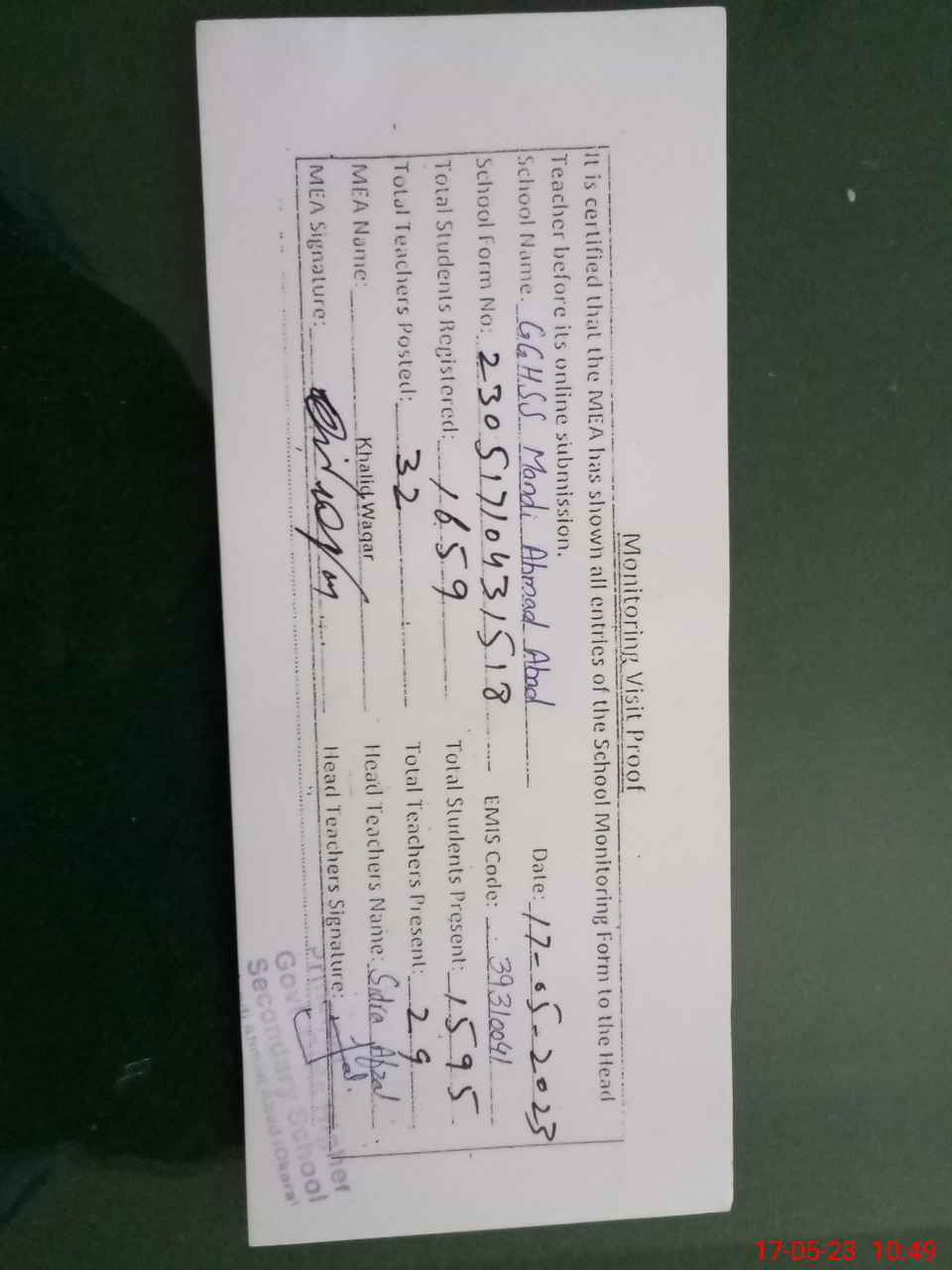 | Certified that this School was Inspected by the Undersigned MEA/DMO Today and the Information Stated Above is as Per Record. | |||||