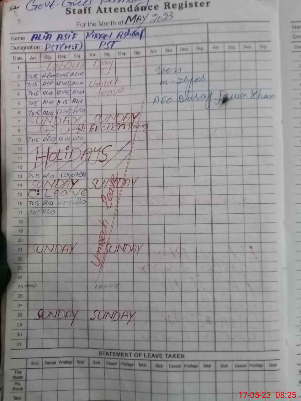 | Monitoring Date: 17-05-2023 | Start Time: 17-05-2023 08:25 AM | End Time: 17-05-2023 08:49 AM | Name of MEA: AB**** SA**** | |