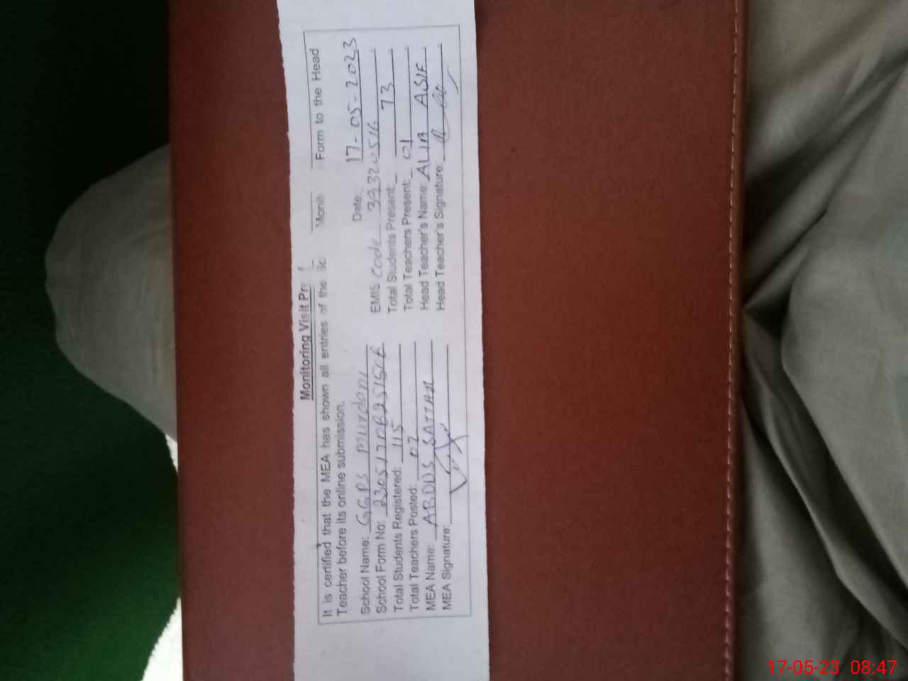 | Attendance Register | Head Teacher | MEA with School | Visit Proof |