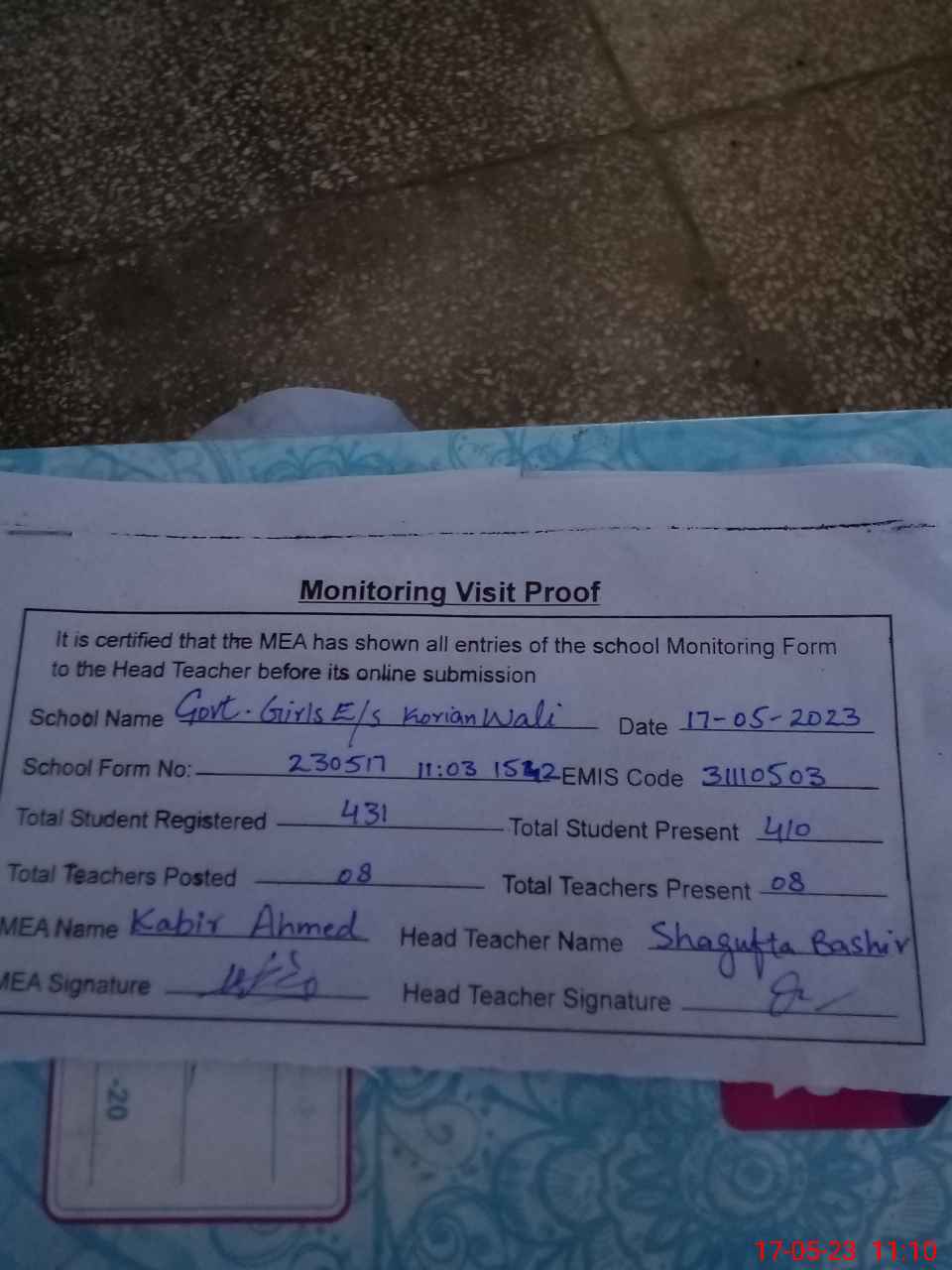 | EMIS Code: 31110503 | Name of School: GGMES KORIAN WALI | |||