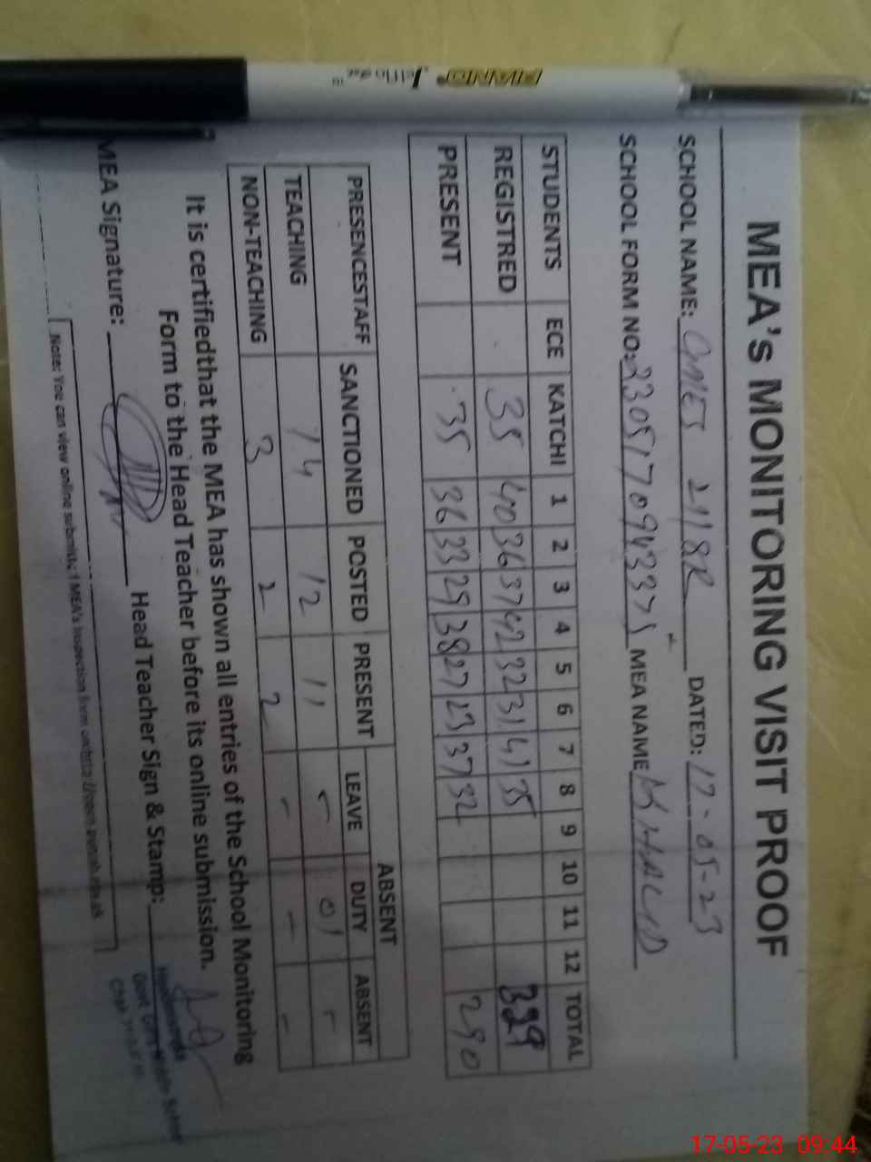 | Attendance Register | Head Teacher | MEA with School | Visit Proof |