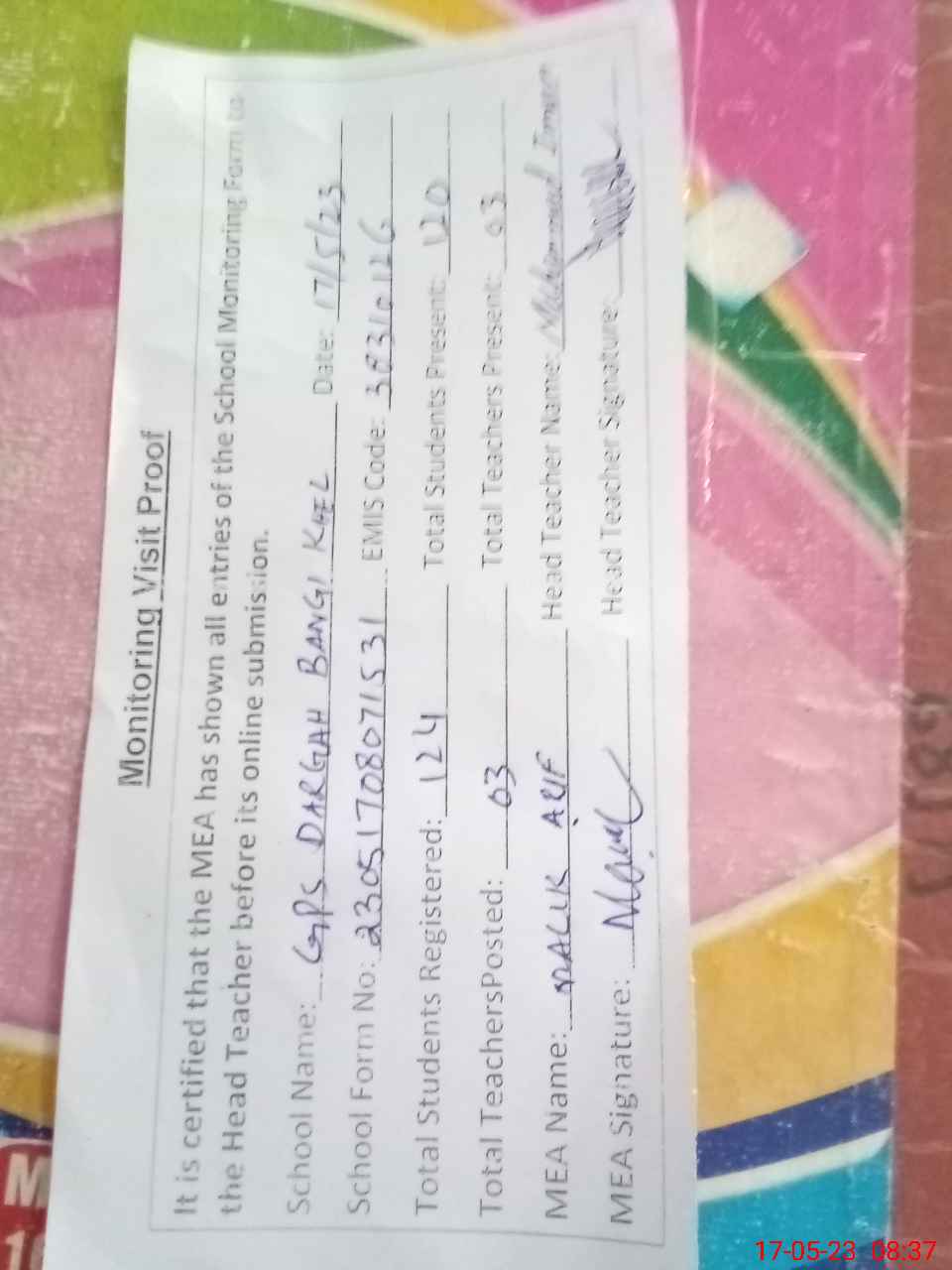 | Attendance Register | Head Teacher | MEA with School | Visit Proof |