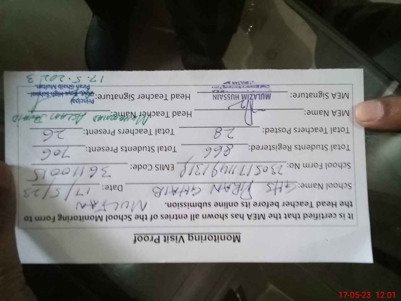 | Attendance Register | Head Teacher | MEA with School | Visit Proof |