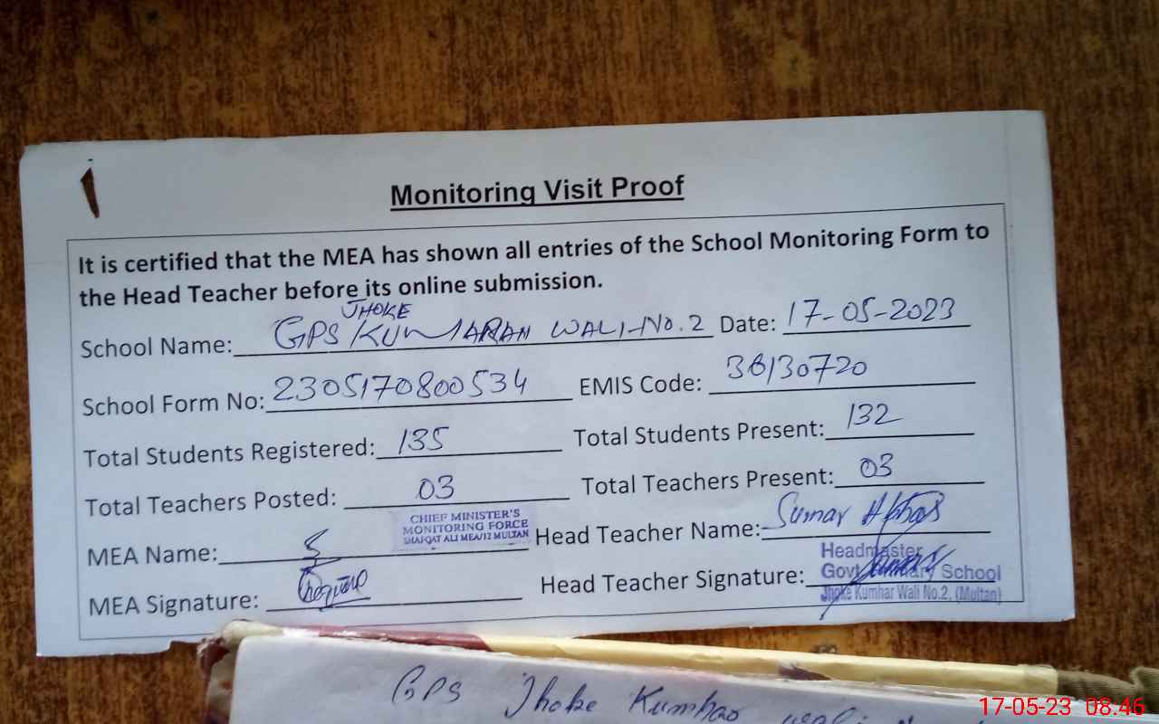 | Attendance Register | Head Teacher | MEA with School | Visit Proof |