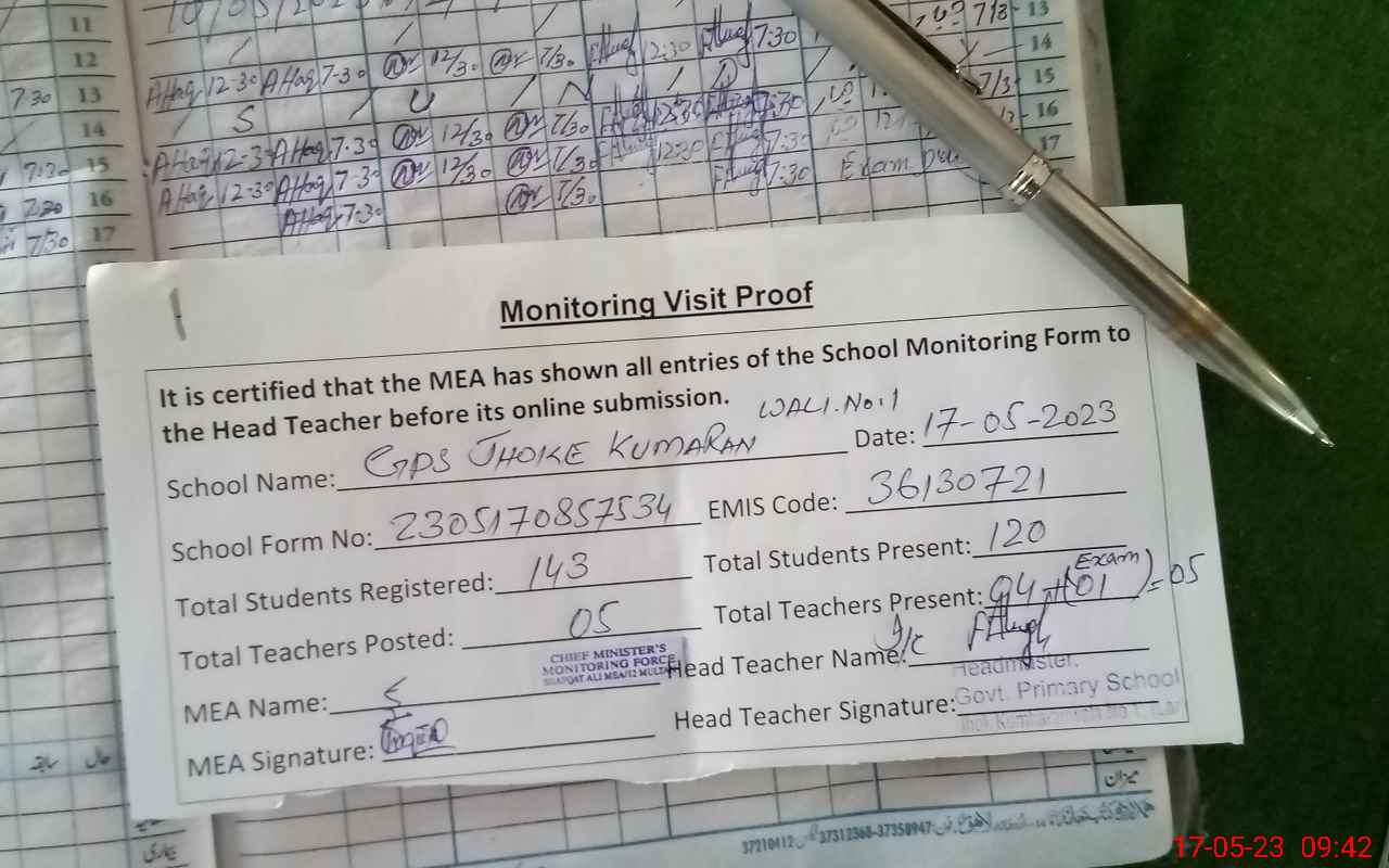 | Attendance Register | Head Teacher | MEA with School | Visit Proof |