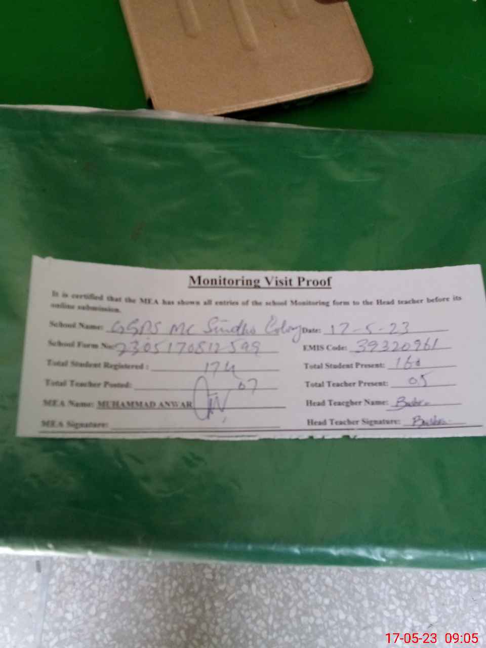 | Attendance Register | Head Teacher | MEA with School | Visit Proof |