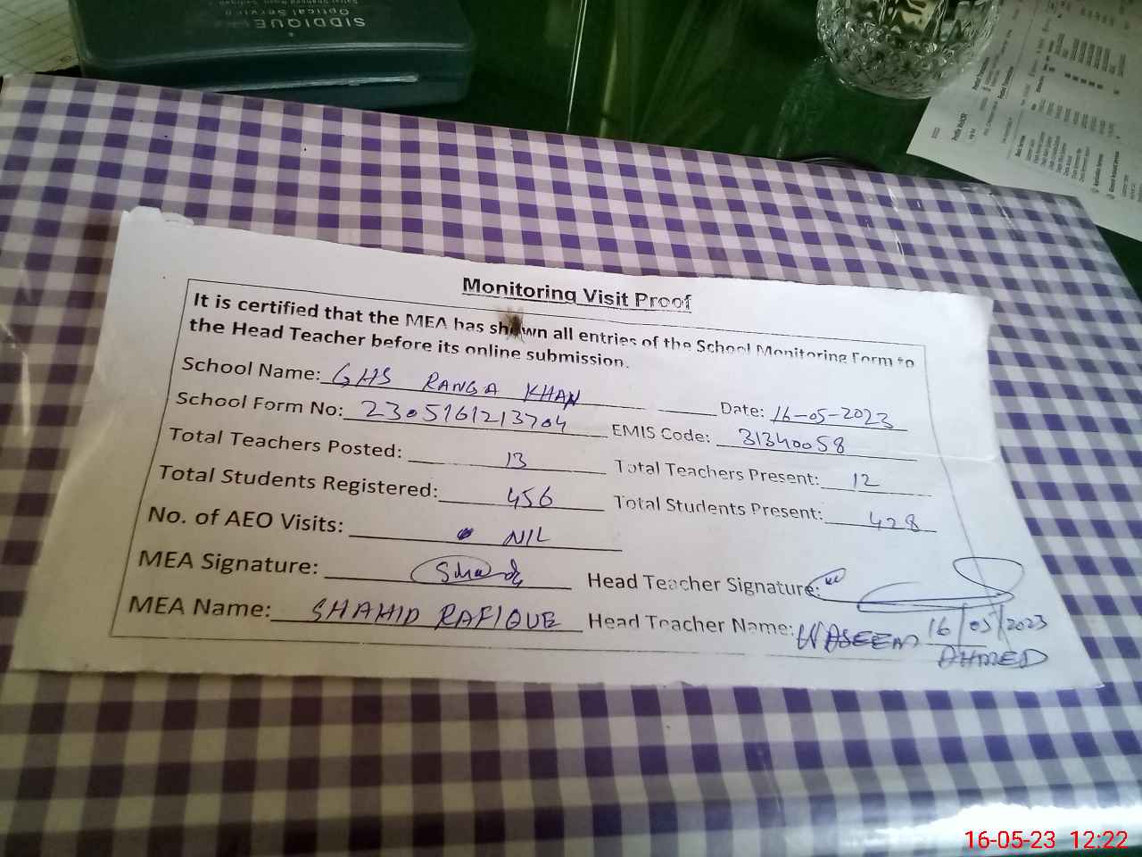 | Attendance Register | Head Teacher | MEA with School | Visit Proof |