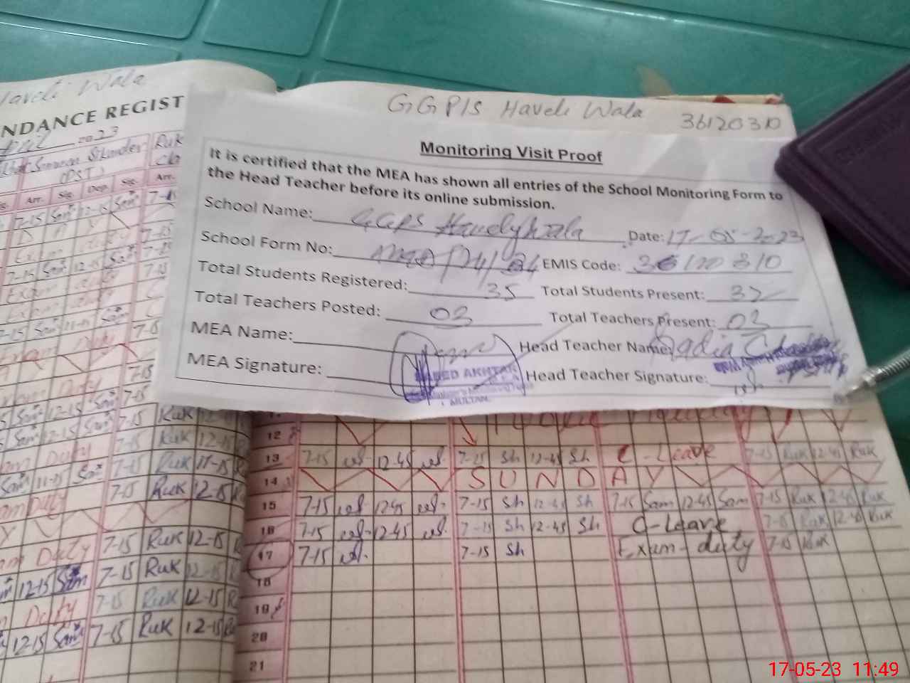 | Attendance Register | Head Teacher | MEA with School | Visit Proof |