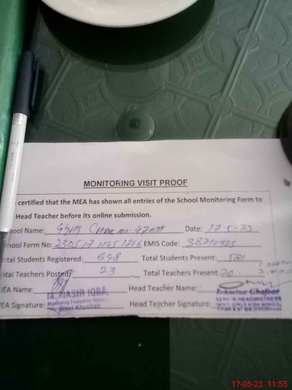 | Attendance Register | Head Teacher | MEA with School | Visit Proof |