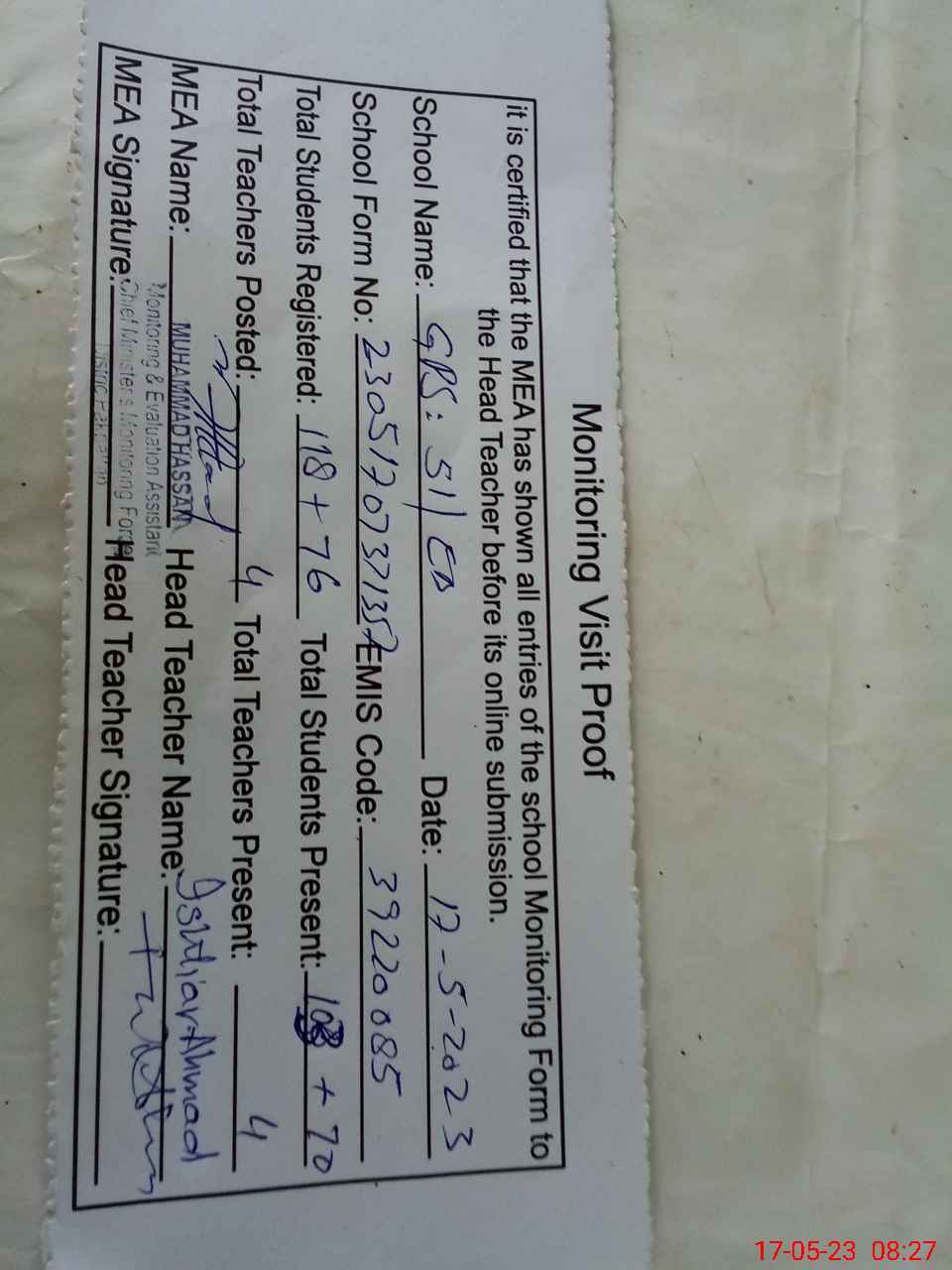 | Attendance Register | Head Teacher | MEA with School | Visit Proof |