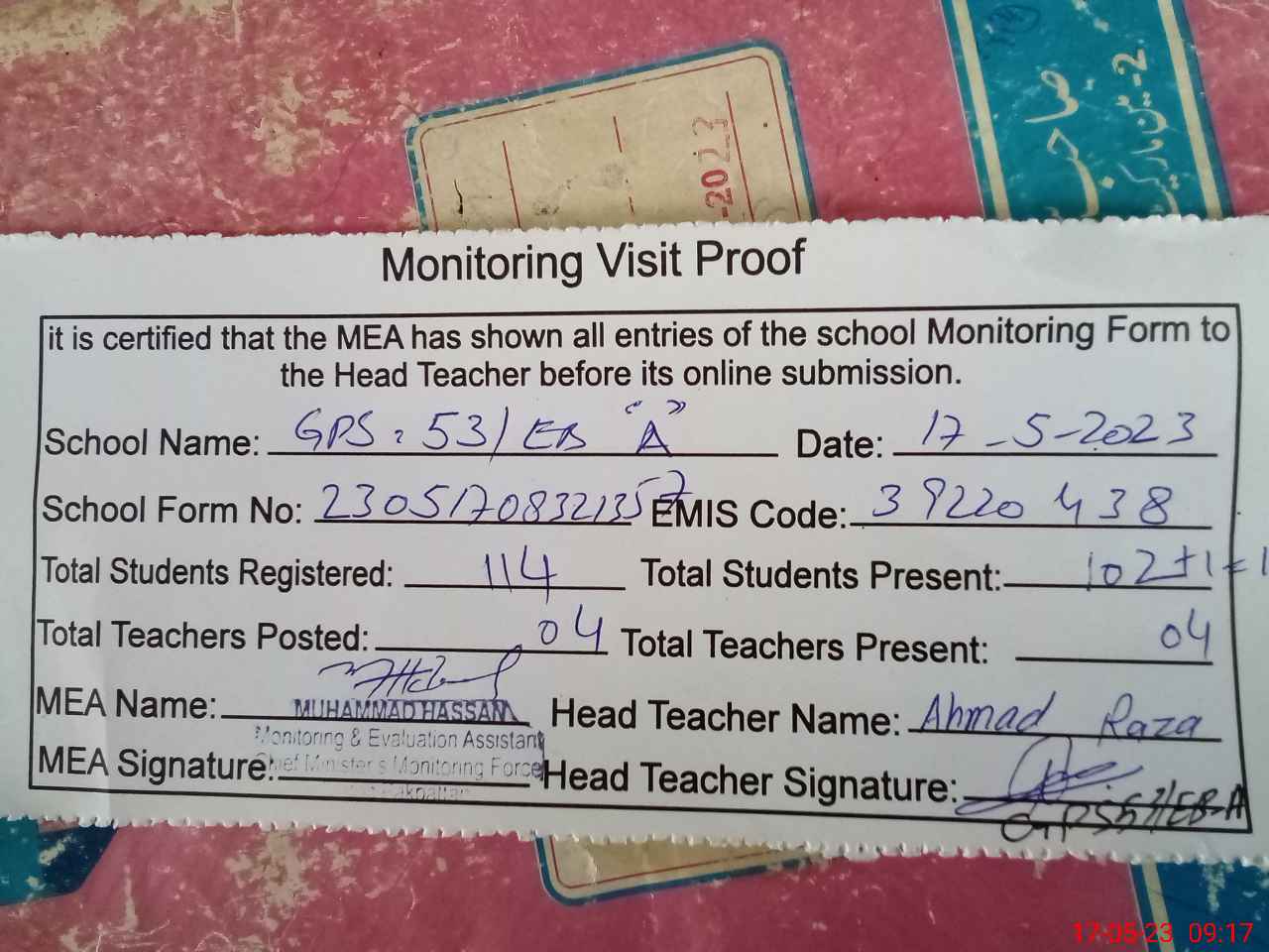 | EMIS Code: 39220438 | Name of School: GPS CHAK NO. 53 EB A | |||