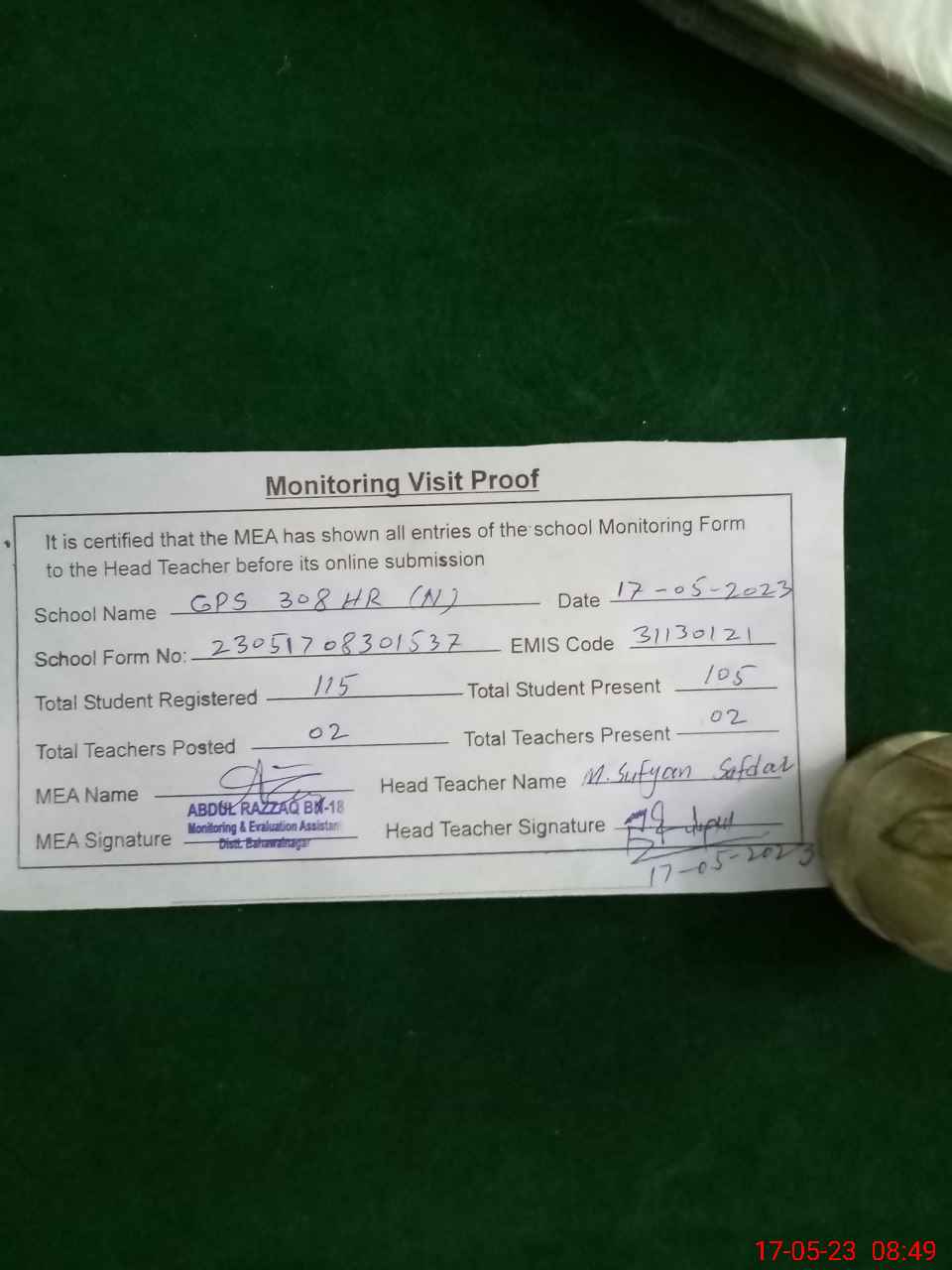 | Attendance Register | Head Teacher | MEA with School | Visit Proof |
