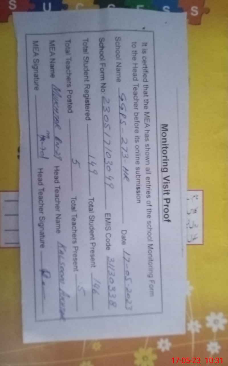 | EMIS Code: 31130338 | Name of School: GGPS CHAK NO 273 HR | |||