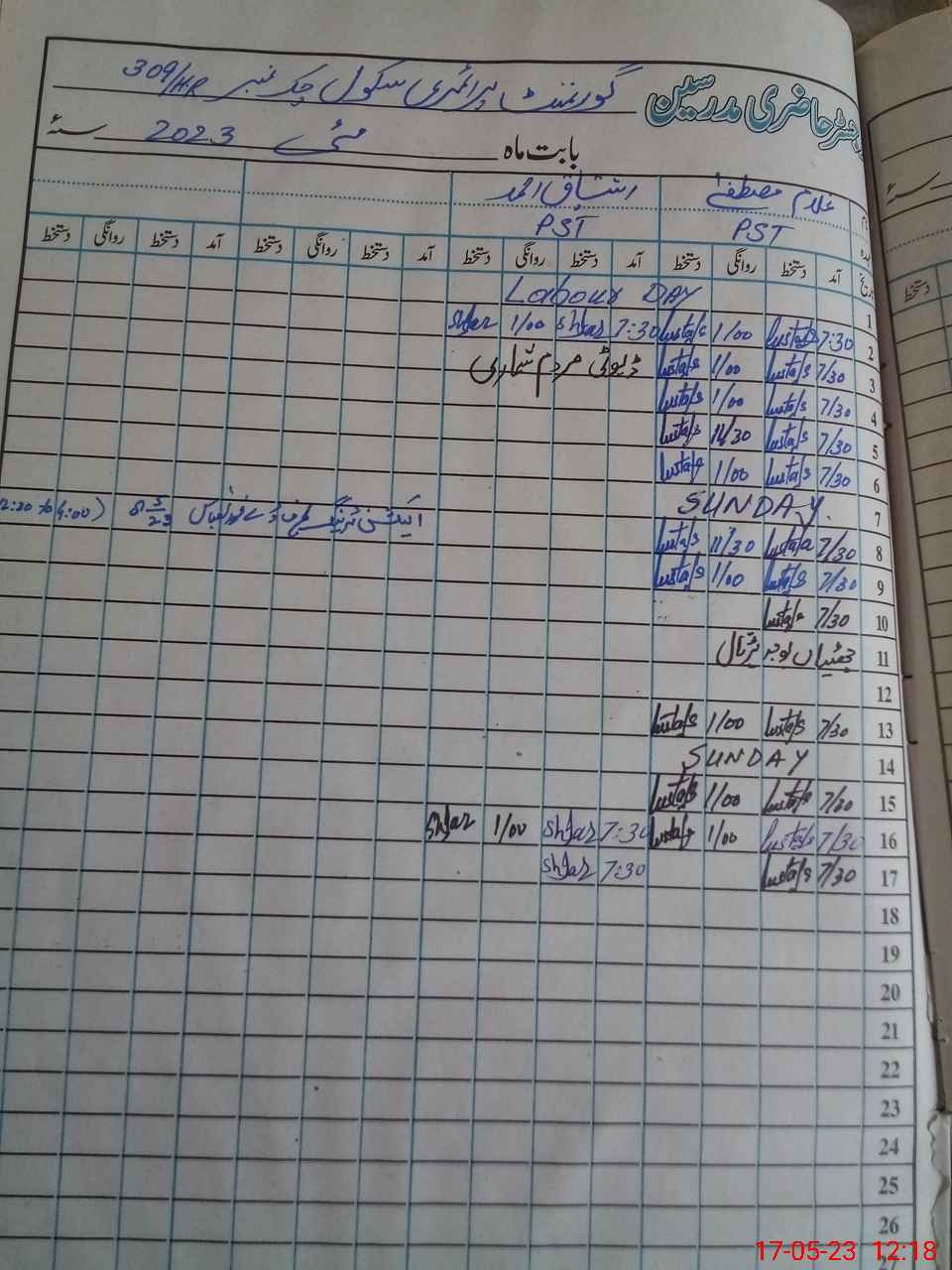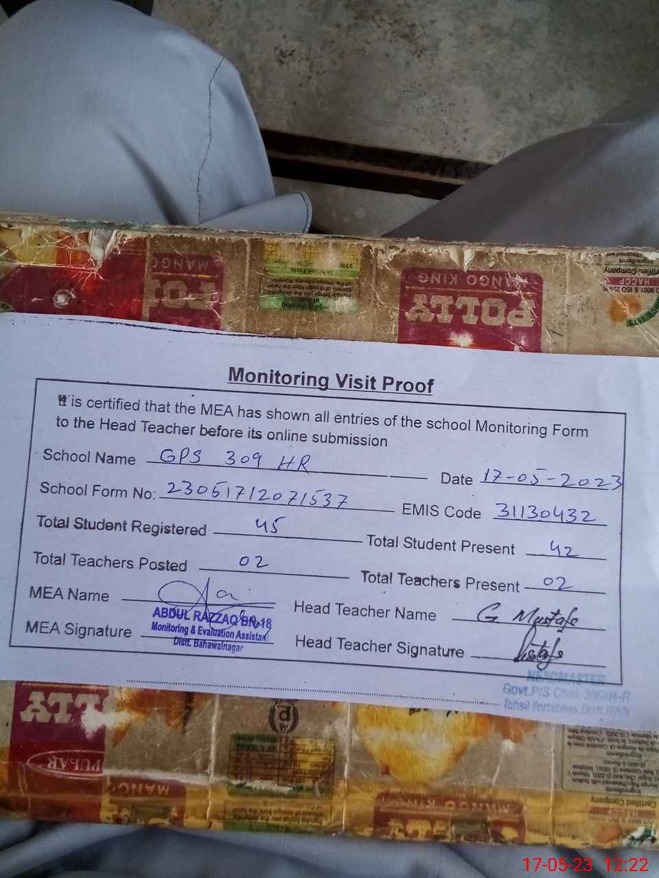| EMIS Code: 31130432 | Name of School: GPS CHAK NO 309 HR | |||