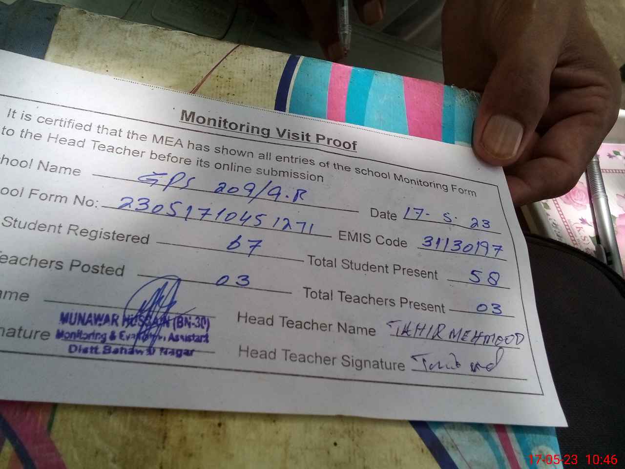 | Attendance Register | Head Teacher | MEA with School | Visit Proof |