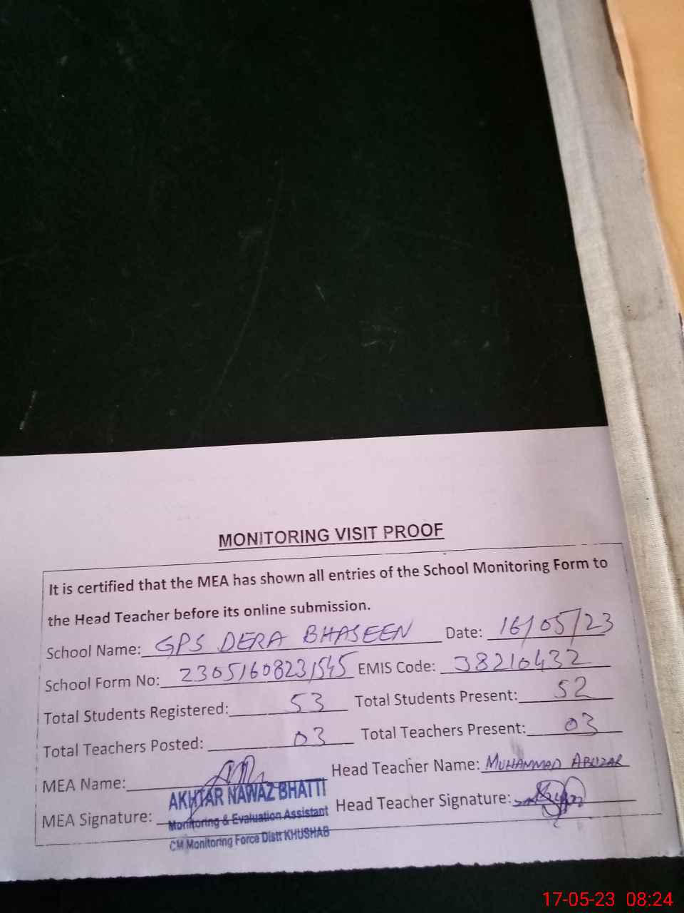 | Certified that this School was Inspected by the Undersigned MEA/DMO Today and the Information Stated Above is as Per Record. | |||||