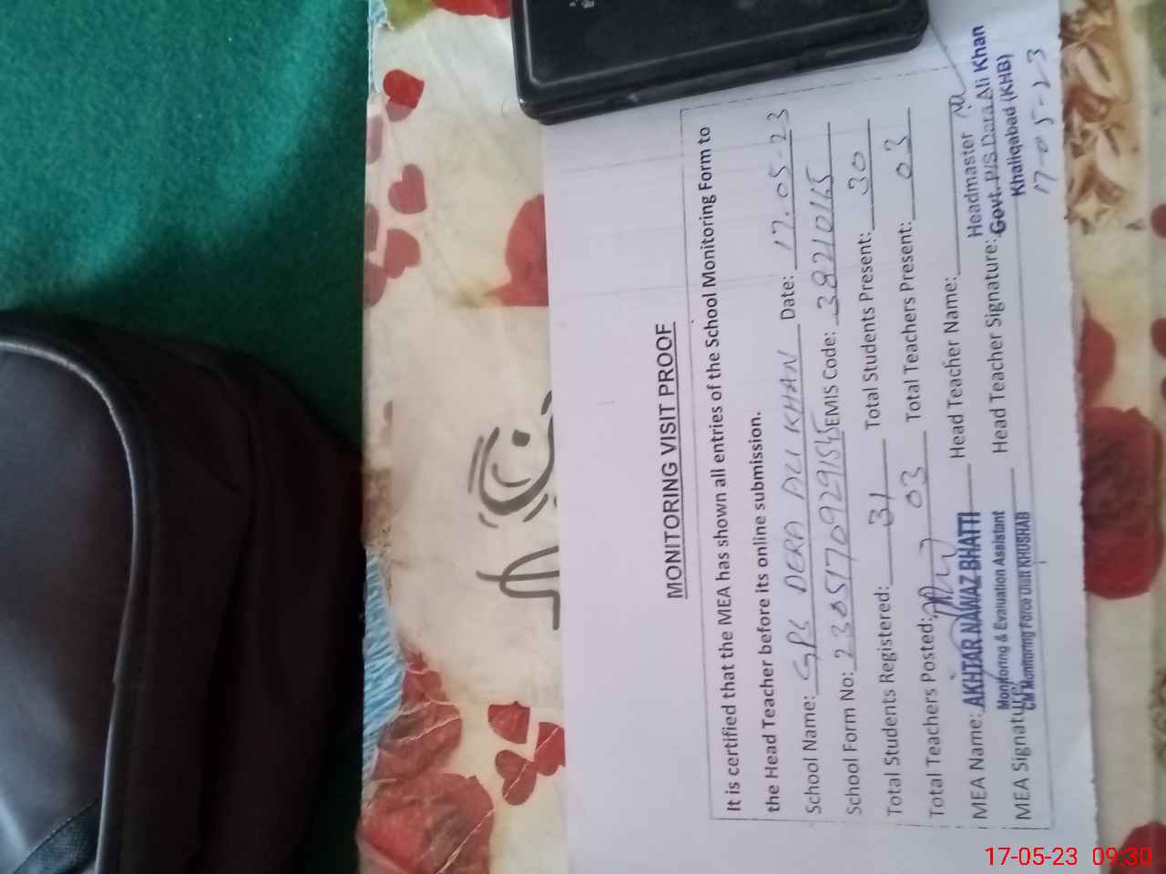| Attendance Register | Head Teacher | MEA with School | Visit Proof |
