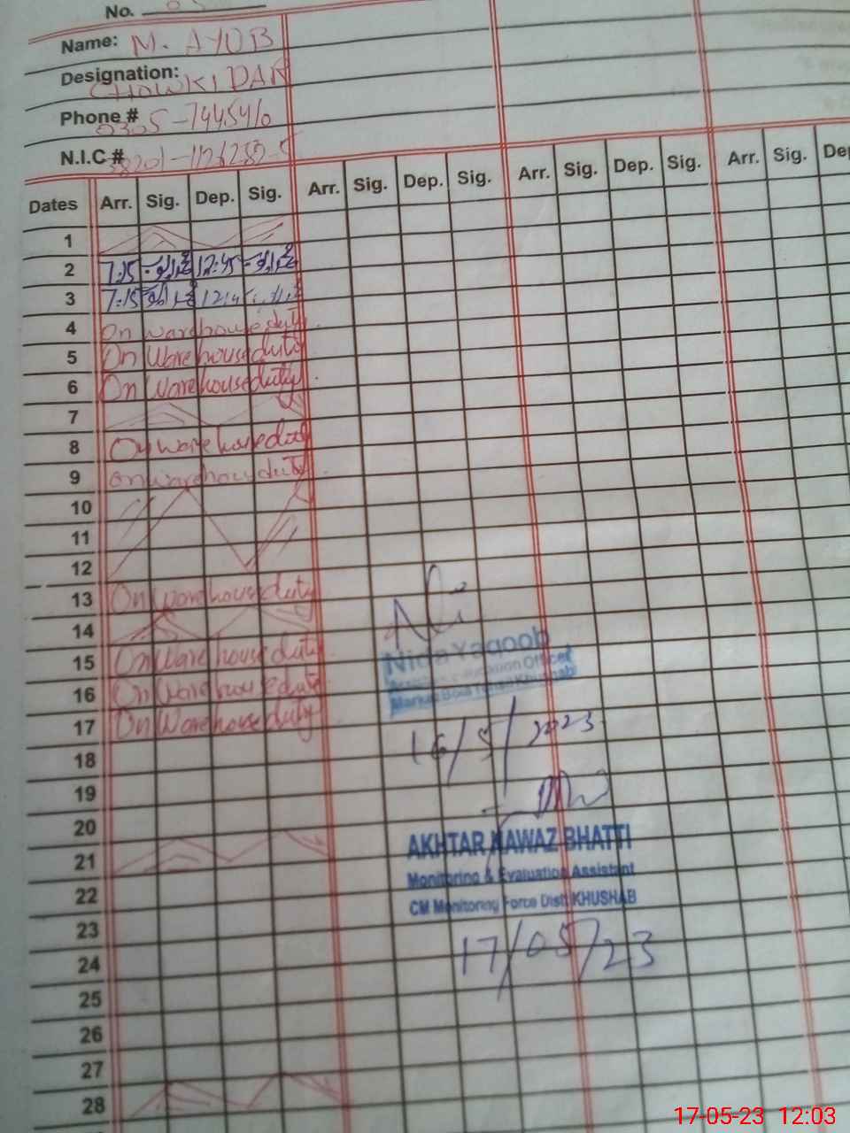 | CNIC | Full Name | Designation | R/C | Absence during last cal. month |