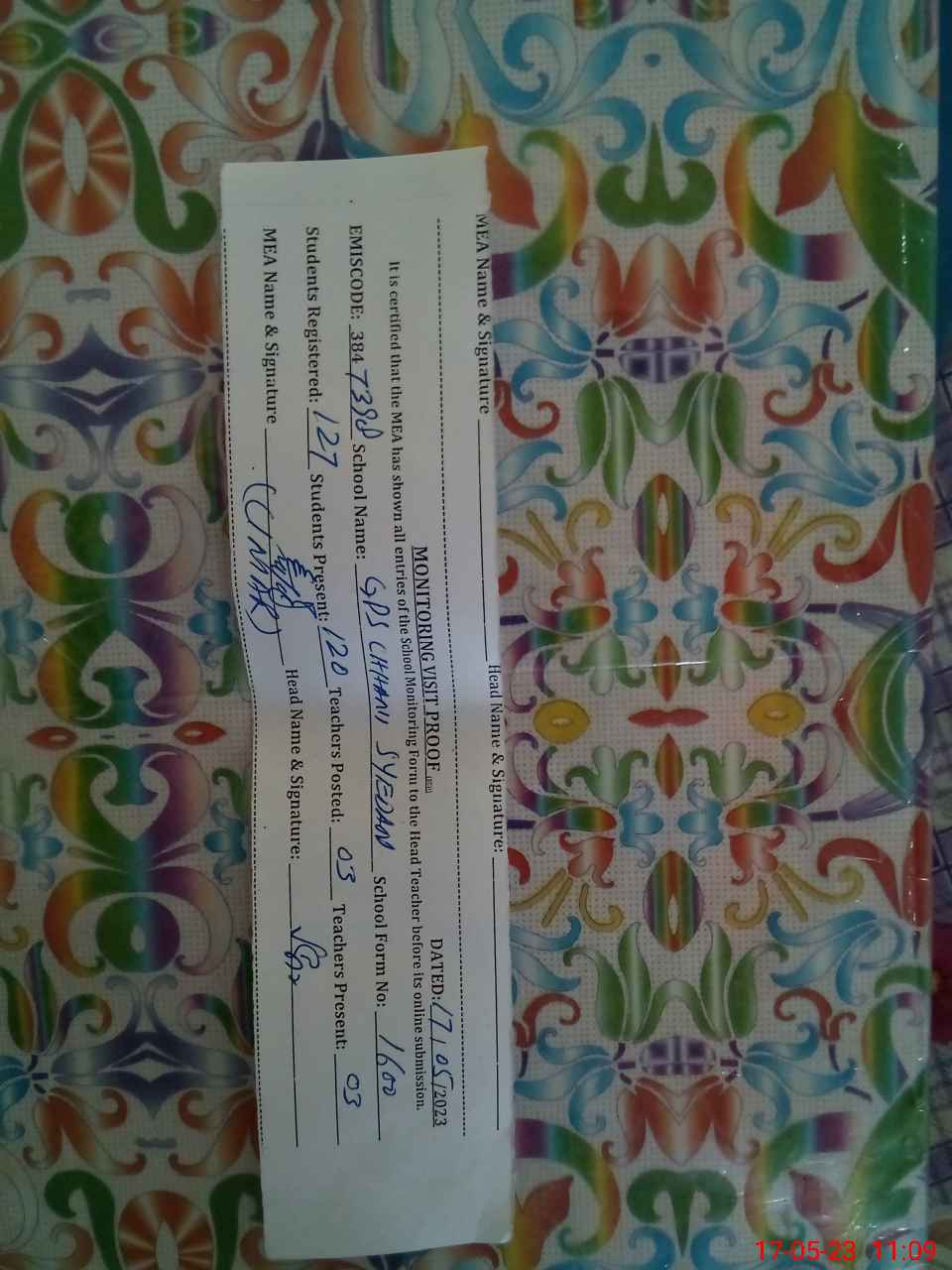 | Attendance Register | Head Teacher | MEA with School | Visit Proof |