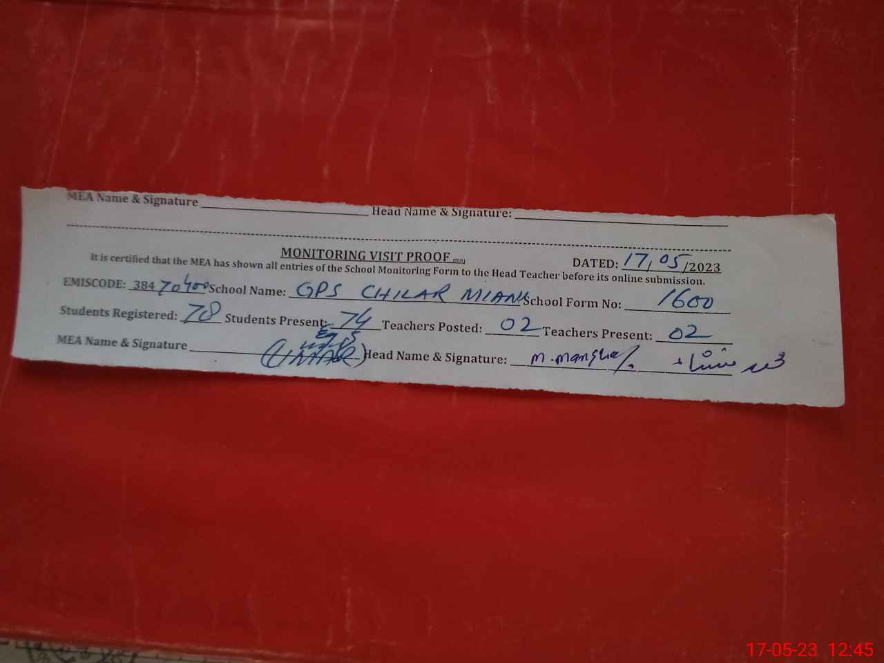 | EMIS Code: 38470400 | Name of School: GPS CHILLAR MIANI | |||