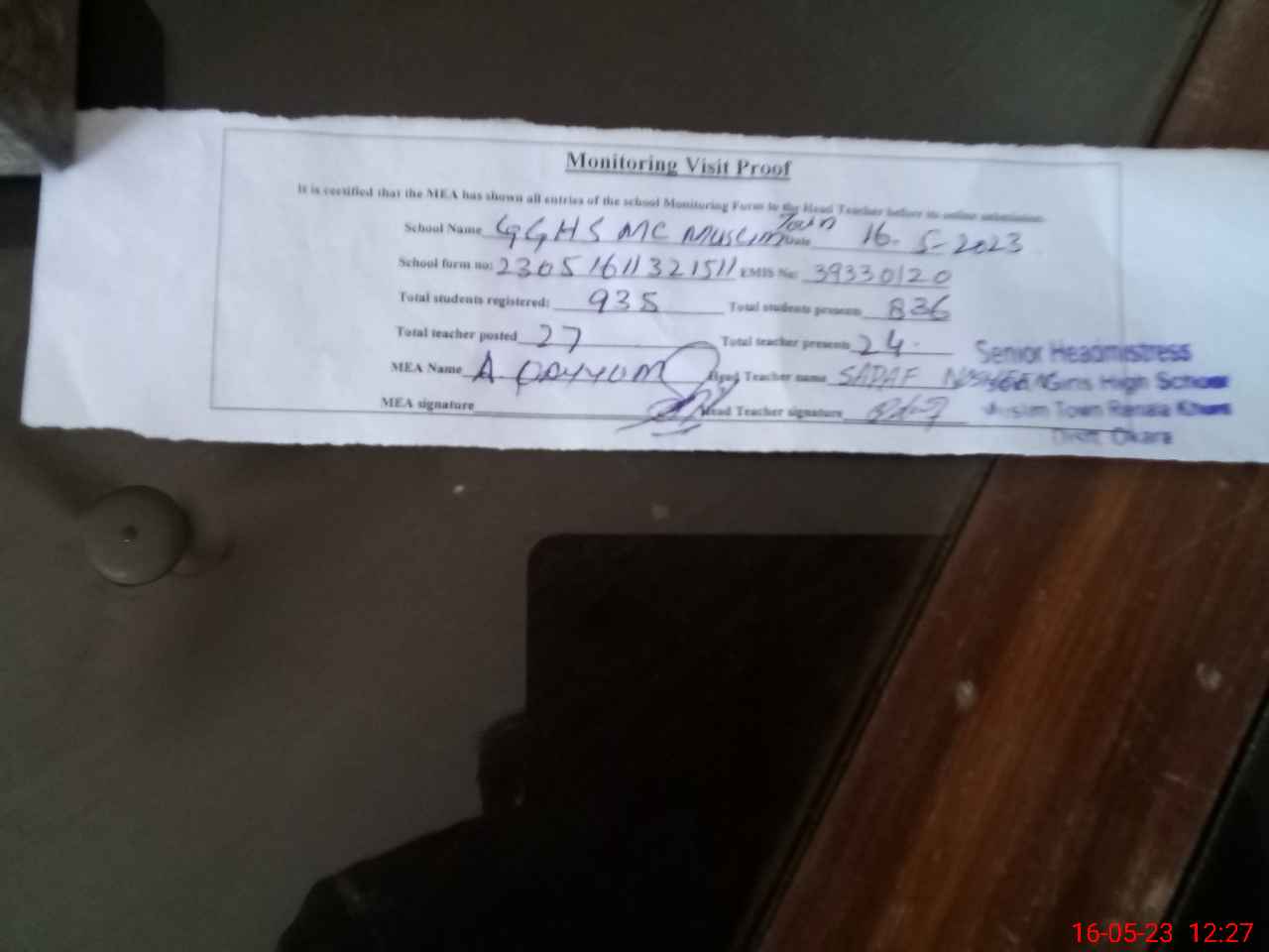 | Attendance Register | Head Teacher | MEA with School | Visit Proof |