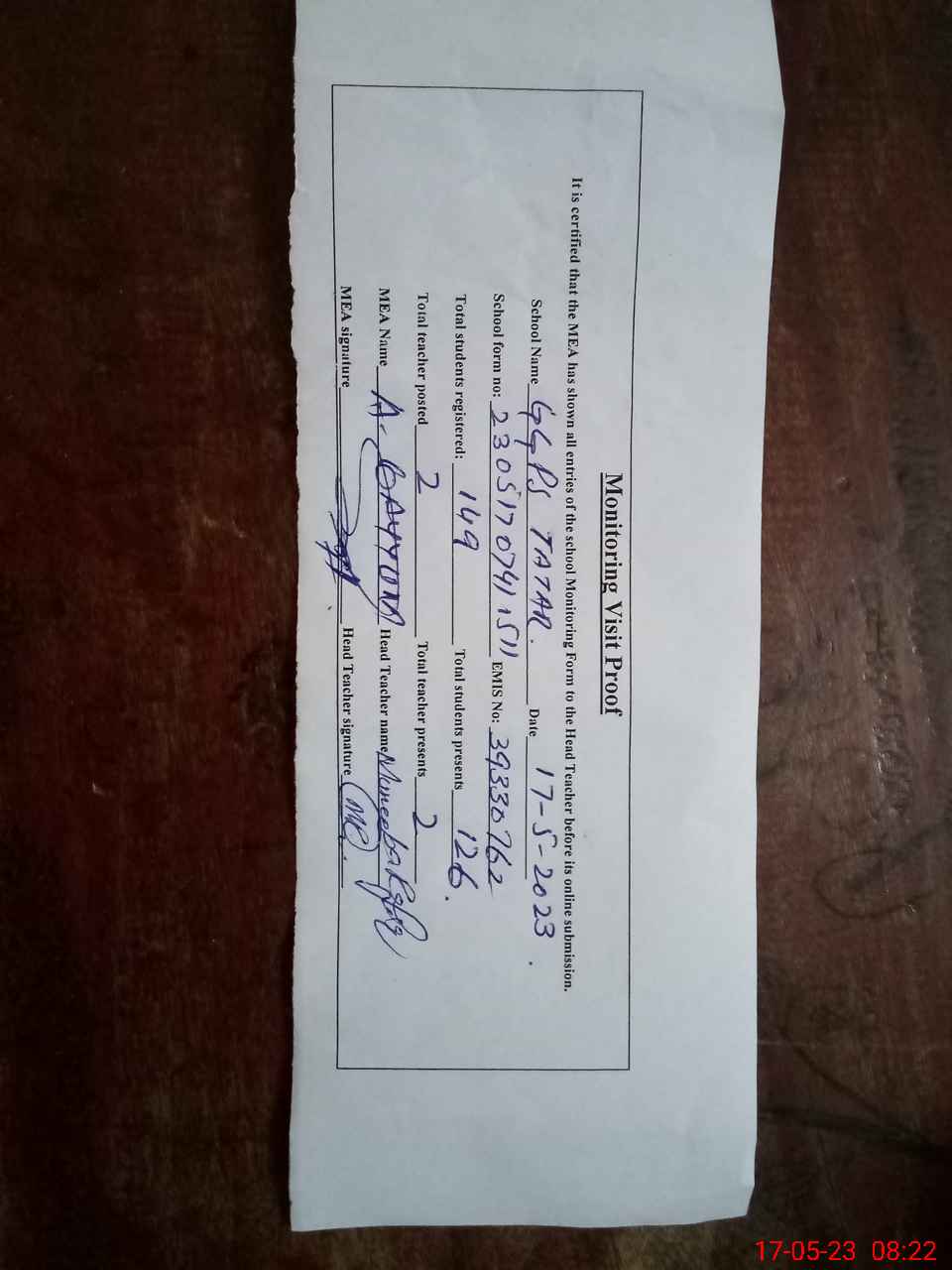 | Attendance Register | Head Teacher | MEA with School | Visit Proof |