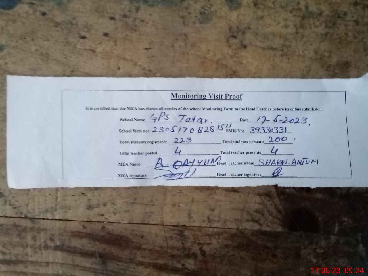 | Attendance Register | Head Teacher | MEA with School | Visit Proof |