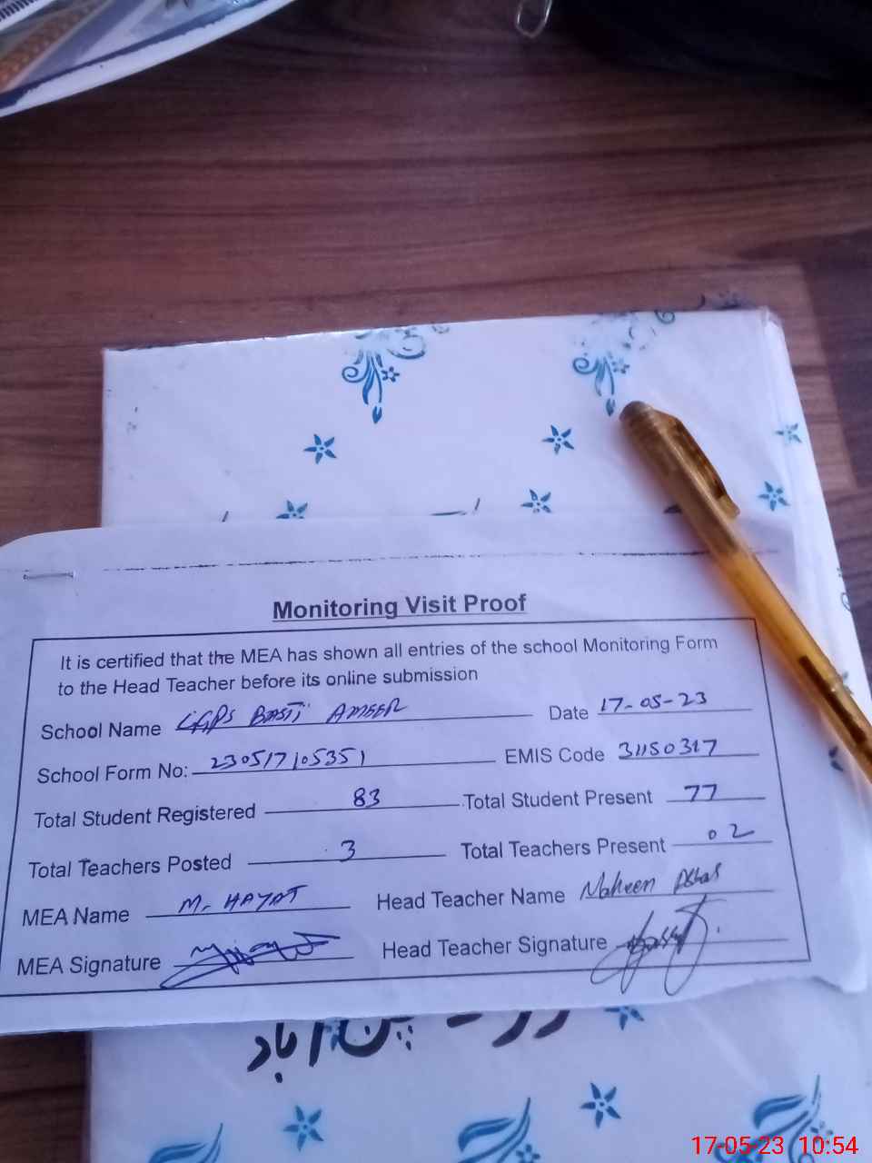 | Attendance Register | Head Teacher | MEA with School | Visit Proof |