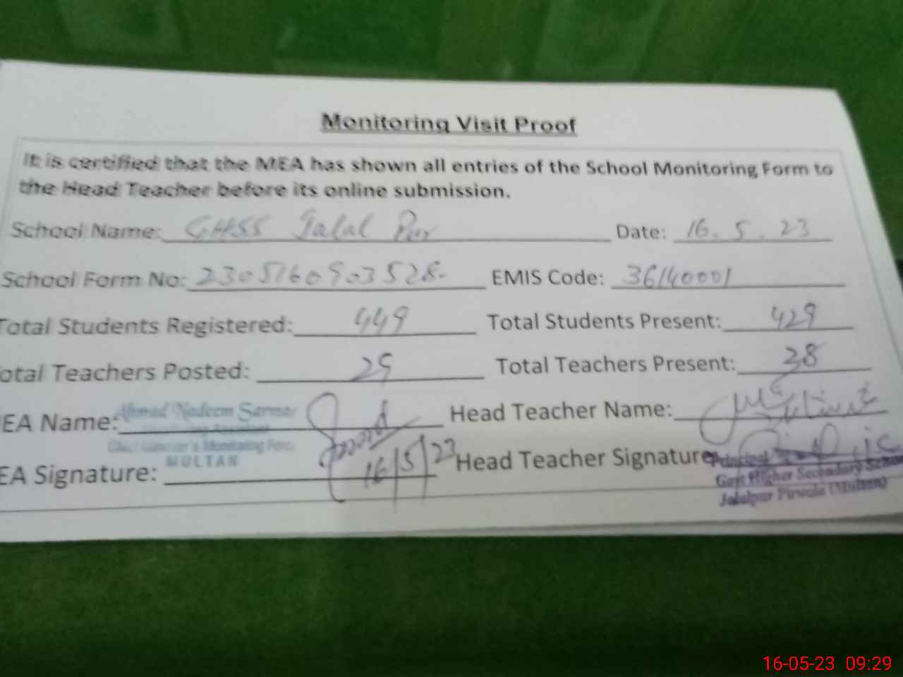 | Attendance Register | Head Teacher | MEA with School | Visit Proof |