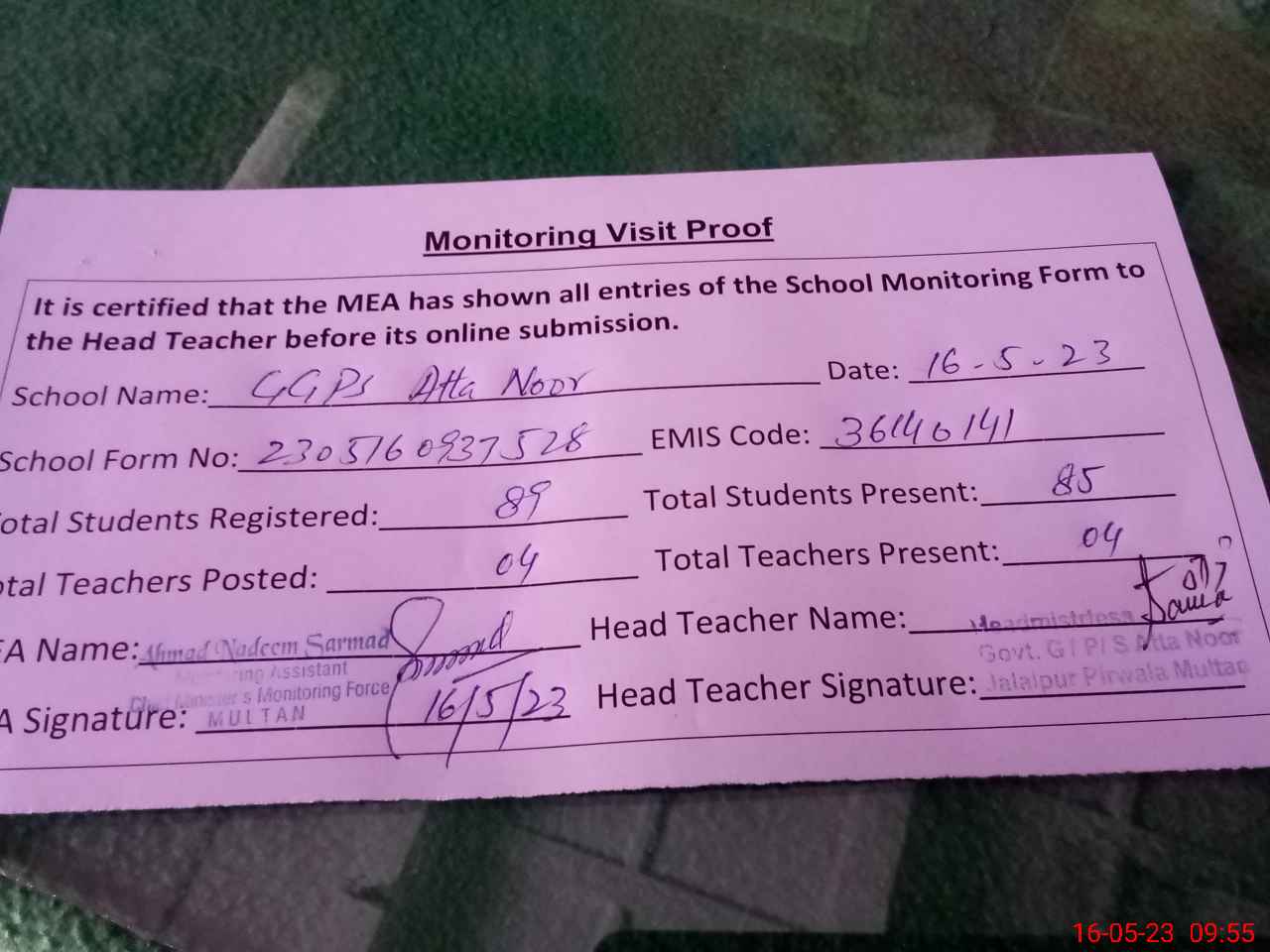 | Attendance Register | Head Teacher | MEA with School | Visit Proof |