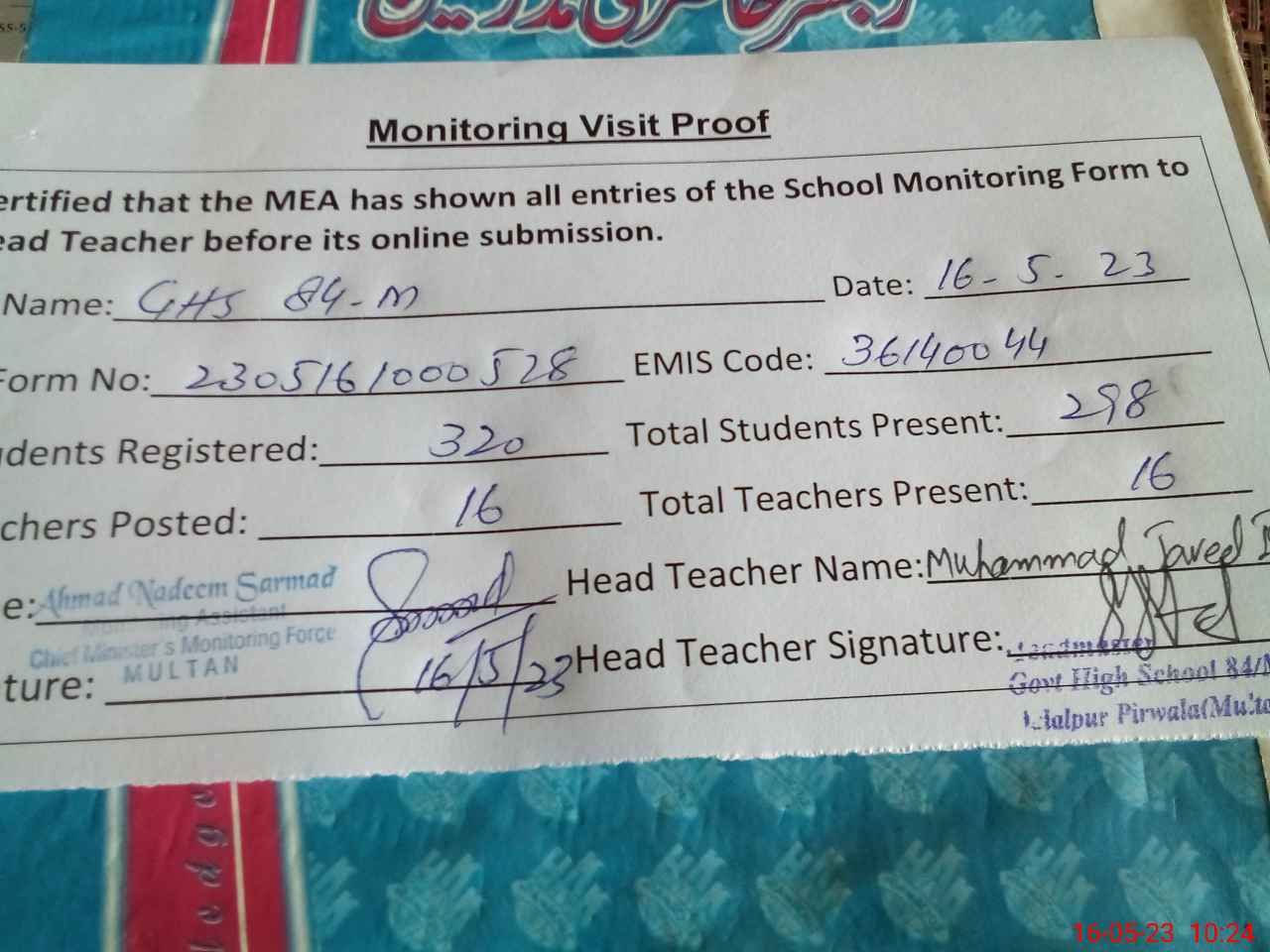 | Certified that this School was Inspected by the Undersigned MEA/DMO Today and the Information Stated Above is as Per Record. | |||||