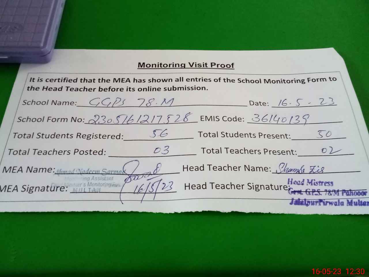| Attendance Register | Head Teacher | MEA with School | Visit Proof |