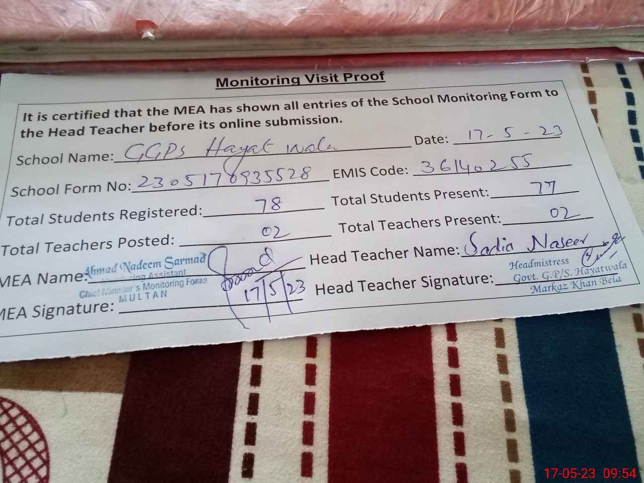 | EMIS Code: 36140255 | Name of School: GGPS HAYAT WALA | |||