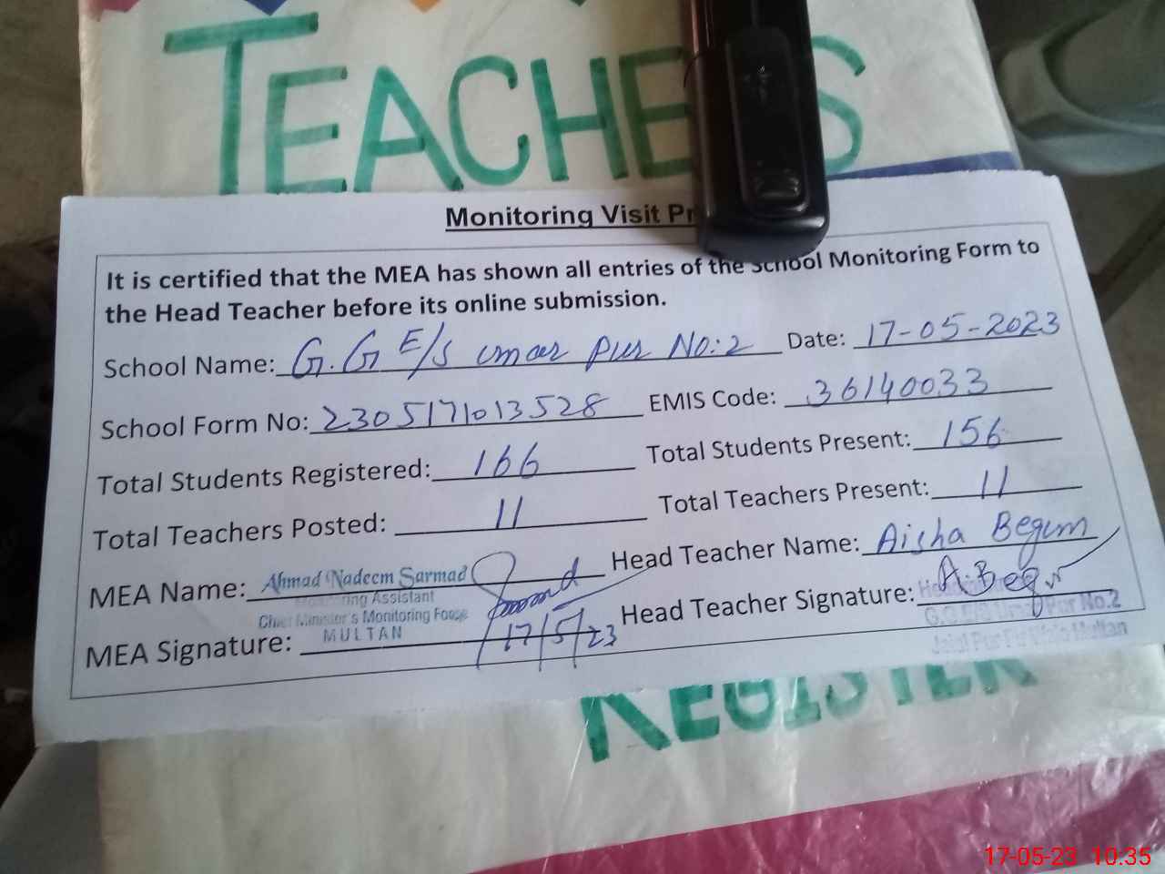 | Attendance Register | Head Teacher | MEA with School | Visit Proof |