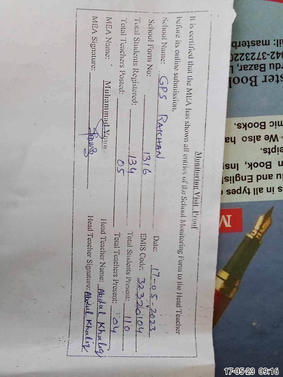| Attendance Register | Head Teacher | MEA with School | Visit Proof |