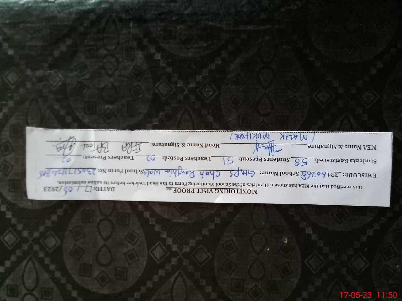 | Attendance Register | Head Teacher | MEA with School | Visit Proof |