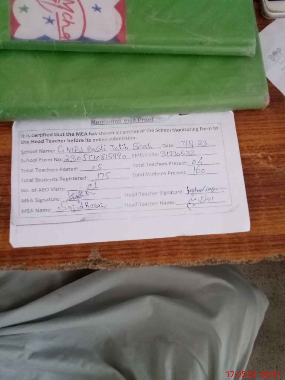 | Attendance Register | Head Teacher | MEA with School | Visit Proof |